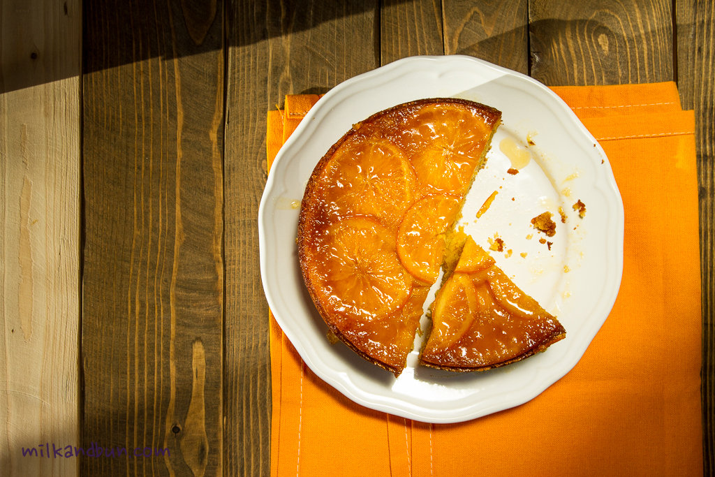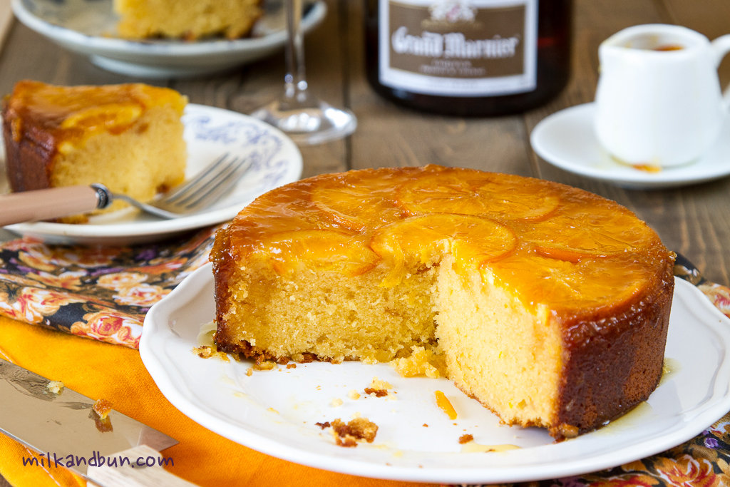 - Preheat oven to 180C. Grease the 18cm loose-bottomed cake tin. Sprinkle the base with demerara sugar. Arrange orange slices on the base, making overlapping layer.