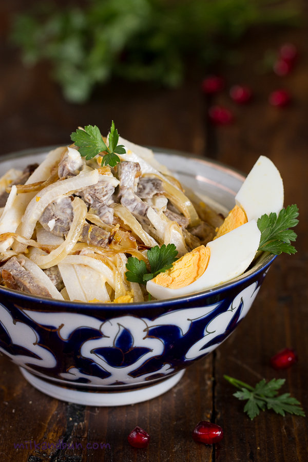 Tashkent is the capital of Uzbekistan, one of the former USSR countries. According to one version this salad was created in Moscow during USSR times, when Soviet government set the task to popularize the various national cuisines of the Soviet Union. Due to a very limited availability of the ingredients in most parts of the USSR, Soviet cuisine can be characterized as simple. So, the salad also had to be simple, tasty and nourishing. Another version says that the salad was created by chef of the “Tashkent” restaurant in Moscow, where it also was served for the first time.
