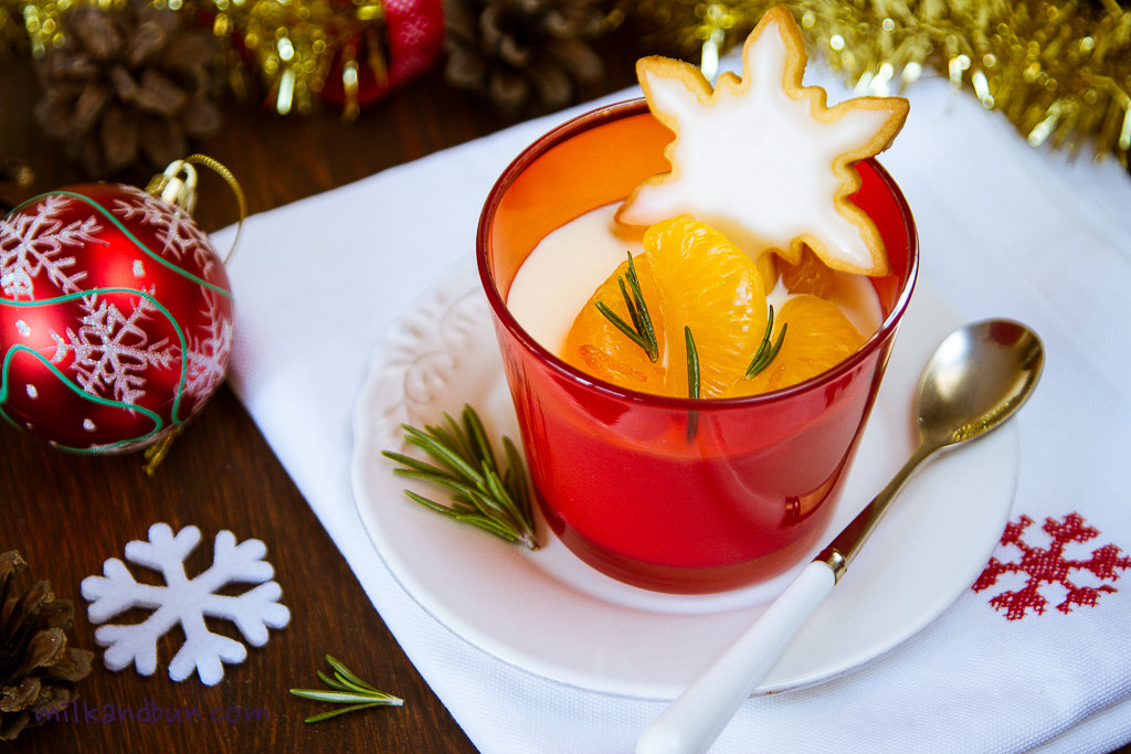 Everything in this dessert says ‘winter’: delicate and tender snowflakes (recipe coming soon), smooth and creamy panna cotta that looks almost like a real snow-blanket, rosemary “pine needles”, and of course aromatic mandarin -segments. Another great thing about this dessert is that it looks like you really fussed over it. Shhhh…  😉