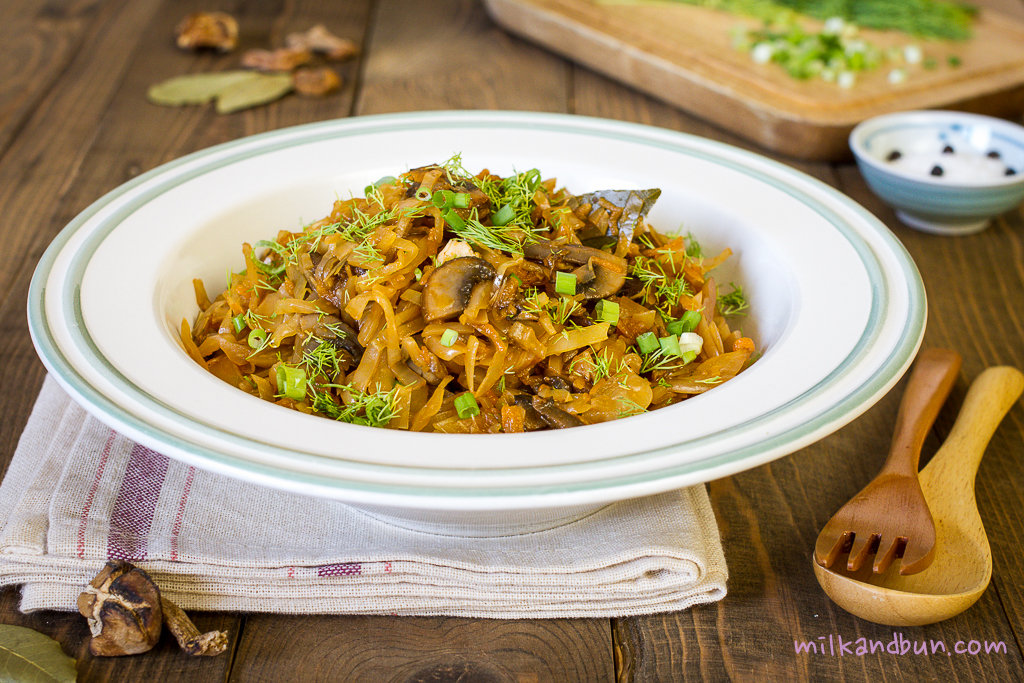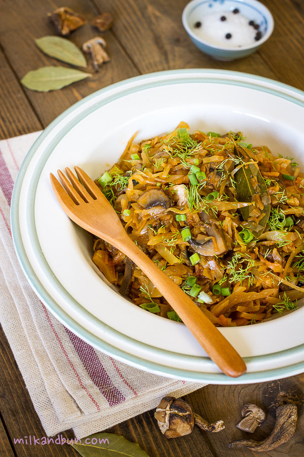 As I already mentioned the recipe is really simple but takes time and patience to prepare, you have to stir cabbage regular so its color will be nicely dark but not burned. I used dry mushrooms along with fresh, as they add amazing flavor and unique taste to the whole dish; if it’s the right season and you are like to get fresh wild mushrooms – use it (like chanterelle or little honey mushrooms, or fresh porcini). It is a perfect vegetarian dish. If desired extra protein – serve the cabbage with roasted chicken or sausages.
