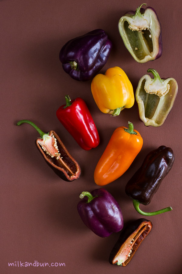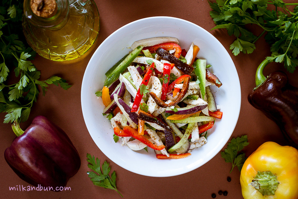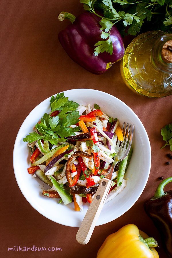 I picked up these beautiful capsicums there, I have never seen purple peppers in supermarkets before and couldn’t resist to taste them. It’d be so pitied to lose its amazing color so I decided to keep them raw and prepared this simple and tasty salad. Do you know that capsicum contains more vitamin C compared to an orange? This salad is not only bright but also nutritious and healthy. As a bonus, it’s low in carbs so perfect to stay fit and if you’re on diet – to lose a little bit weight without hanger. Yum! 🙂