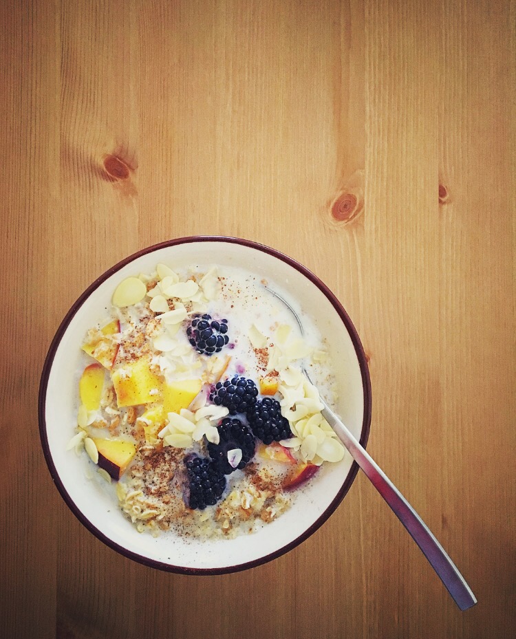 I add some milk into a bowl of mixed flakes, then allow it to stand for a while (if I’ve got a time), then it goes to the microvawe (bless God the man who created it!), stir, add fresh berries and chopped fruits (I used blackberries and nectarines this time), sprinkle with almond flakes. Adding a pinch of nutmeg or cinnamon makes the morning cereal only better.