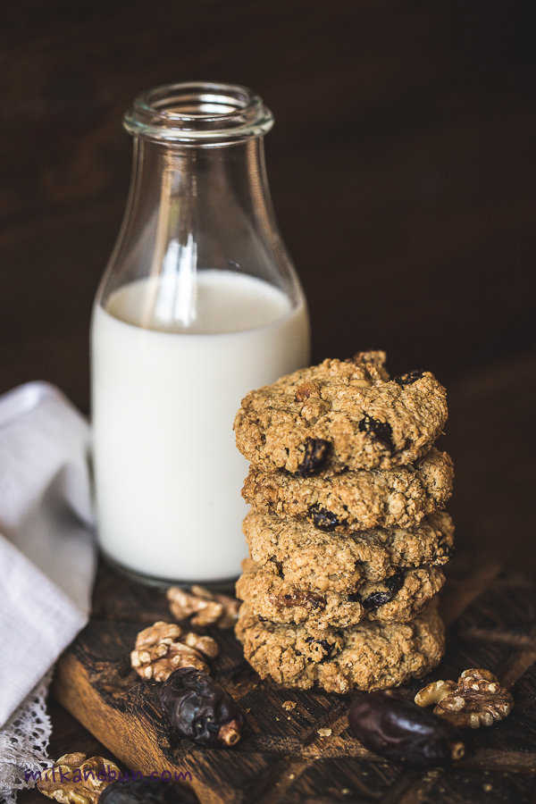 There are thousands recipes of oatmeal cookies, I guess. Needless to say, I prefer homemade cookies to store-bought. Homemade is homemade, right? Plus I can vary the amount of sugar, thus you can feel that you’re eating oat cookies, not sugary cookies with oats! And of course, you can add your fav nuts or chocolate chips as much as you like. 😀 Personally, I don’t like chocolate chips in cookies. I add it sometimes too, but almost never do it; choco chips contain more sugar than pure chocolate; so if I deliberately reduce the sugar in a recipe why should I add more sugar but in another form.. I prefer roughly chopped dark chocolate, it’s healthier and adds much more flavour and taste! Add a small handful of dried berries or fruits for extra deliciousness! 🙂Oatmeal cookies with dates-1
