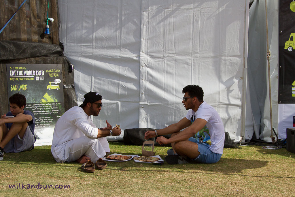 I visited “Eat the World Dubai” as a part of the Dubai Food Festival 2016. It was held on a green lawn (which is called Burj Park), right next to Burj Khalifa and the Dubai mall. It was all about street food. The most exciting thing was that 15 food trucks were brought from the UK, and as it was announced ‘the best ones’- winners and finalists of British Street Food Awards. Of course, some local street food there was as well.