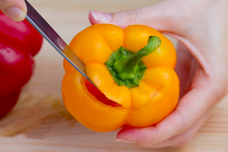 Meanwhile, wash capsicums, cut the tops off each pepper and remove seeds. If peppers do not stand up straight, slice a little (!) off the bottom of the pepper to level it out.