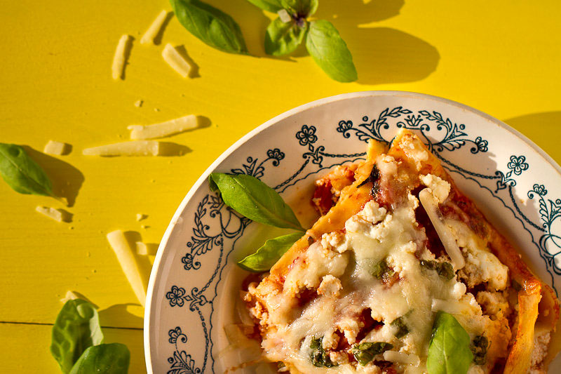 - Spread few spoons of the tomato sauce and chopped spinach in the base of greased gratin dish. Top with 3 sheets of lasagna then spread over half of the sauce and half of the cottage cheese.