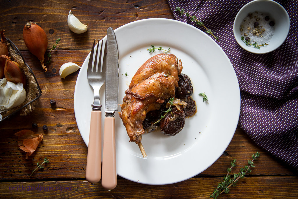 I’m sure you know that Easter is on the way (Catholic falls on April 5 and Orthodox April 12), and you’re probably planning what to cook, or searching your notes with traditional recipes. I think some of you have a special main course recipe for this occasion, or may be it’s a wide range of recipes. What will you choose this year? An elegant dish or simple&casual? I think, with spring bringing nice and pretty weather, that you’re likely to be in the mood for something hearty and light! 🙂Braised Rabbit I’ve always been partial to rabbit; when I’m visiting my parents in Russia I’m always pleased to eat a rabbit stewed in sour cream. It’s always tender and delicious, of course because it’s prepared by my mom. 😀 Today recipe is elegant and great for a special dinner! I’d like you to try rabbit with prunes and thyme, braised in red wine. It requires few ingredients to be transformed into a flavoursome meal! Enjoy!Braised Rabbit with prunes, juniper berries and thyme