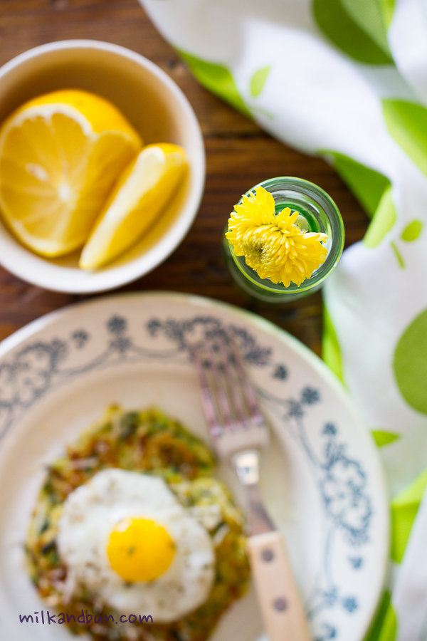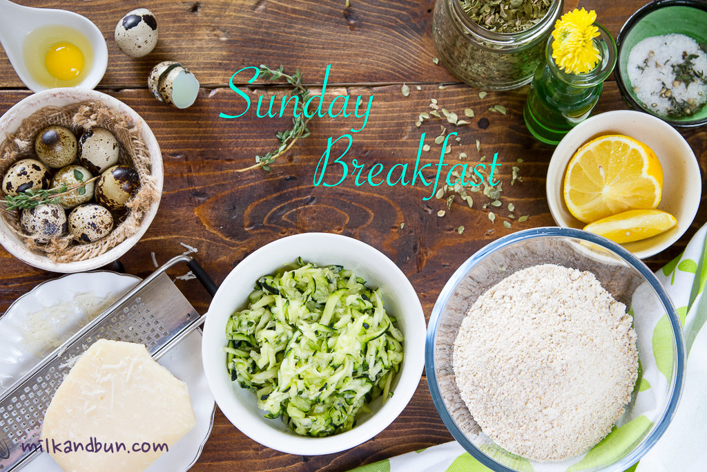 I’m quite sure that almost everyone loves zucchini fritters. We call them oladii/oladushki in Russia, that means small pancakes (have a look another recipe by clicking here). These zucchini oladushki are more healthier, because I used fine oats instead of plain flour and fried them almost without oil. As you can see from the photos: they are served with fried quail eggs, which can be substitute with regular ones; herbs add a nice and aromatic touch – to wake up your senses!Zucchini oladushki with fried quail eggs