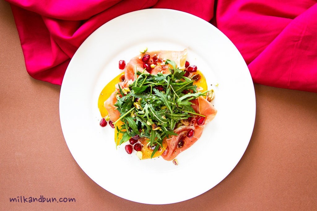 This elegant salad can be served as a tasty fare for the Women’s Day. You need only few minutes literally to assemble and serve the salad. Salty dry-cured meat and tender persimmon slices go perfect together here. Impress your guests or and simply enjoy it yourself.
