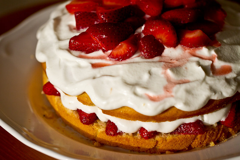 It was usual hot summer day, when ‘why not to make a nice cake with strawberries’ idea came into my mind. I went for the widely known sponge cake, which in Russia is often called biscuit cake. In the US it’s known as pound cake, while in the UK as Victoria cake. Pretty simple to make, could be layered with various berries and feelings.